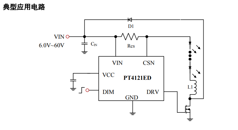 PT4121ED 是一款工作在连续电感电流导通模式的 降压型恒流控制器,用于驱动一颗或多颗串联 LED。PT4121ED 输入电压范围从 6V 到 60V,输出电流可调。 PT4121ED采用高端电流采样设置LED平均电流, 并通过DIM引脚可以接受模拟调光和很宽范围的PWM调光。当DIM电压为低时,PT4121ED关断功率开关, 进入待机状态。 PT4121ED 采用 SOT23-6。